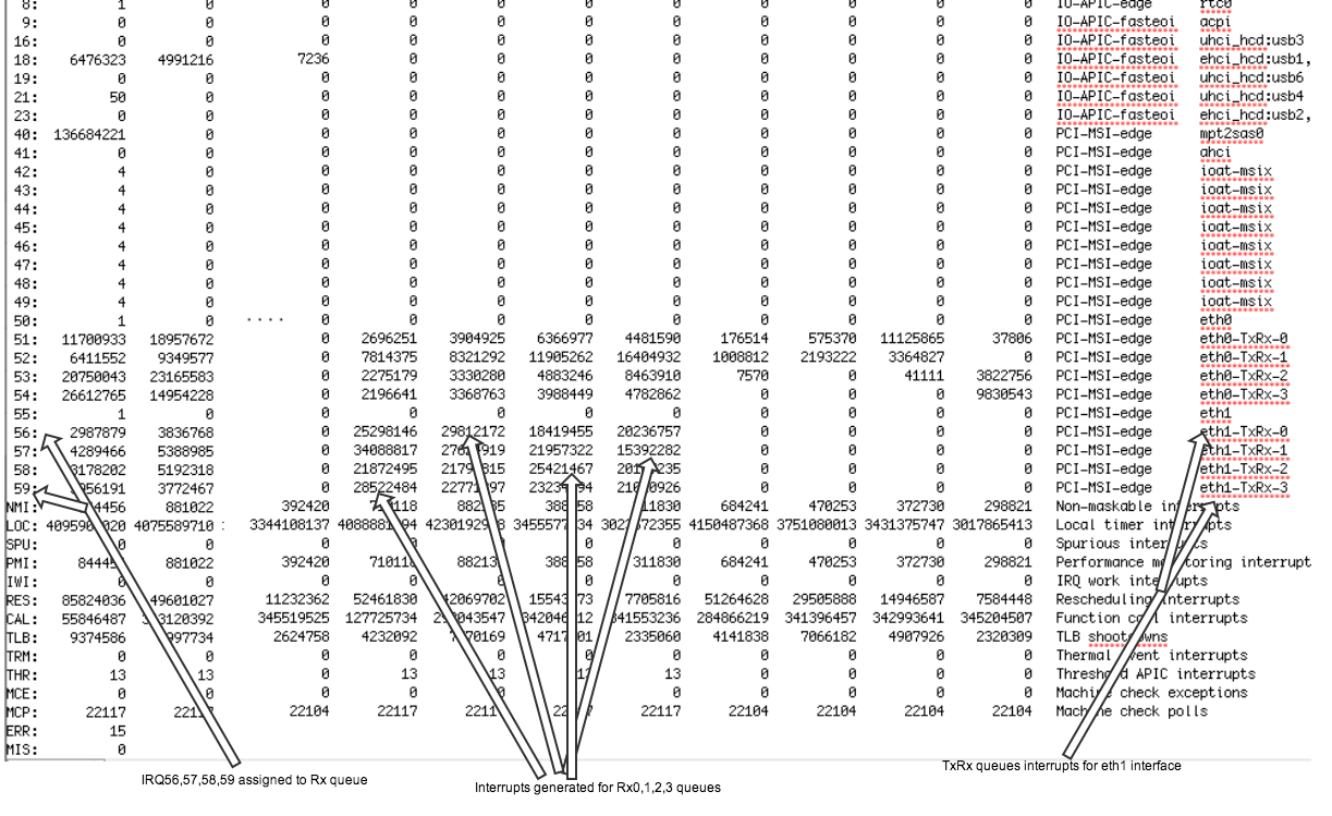 /proc/interruptswhere each queue has an interrupt vector in the 1st column assigned to it. These are initialized when the system boots or when the NIC device driver module is loaded. Each RX and TX queue is assigned a unique vector, which informs the interrupt handler as to which NIC/queue the interrupt is coming from. The columns represent the number of incoming interrupts as a counter value: